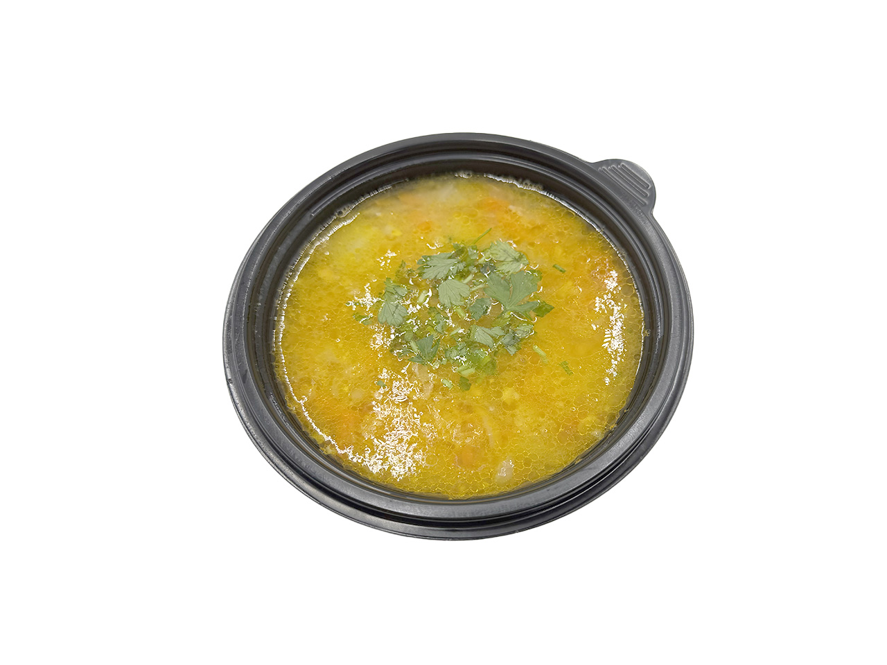 (Куриный бульон, куриное филе, копченая курица, горох, картофель, лук, морковь, соль, перец, чеснок, раст. масло)